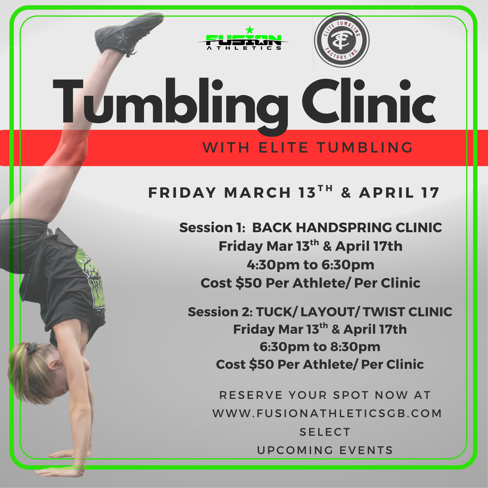 Join Fusion Athletics Green Bay for an Elite Tumbling Clinic designed to sharpen technique and build confidence! Athletes can choose from two focused sessions: a Back Handspring Clinic (4:30-6:30 pm) or a Tuck/Layout/Twist Clinic (6:30-8:30 pm). Each session is $50 per athlete and led by experienced coaches in a high-energy, supportive environment. Perfect for athletes ready to level up their skills!